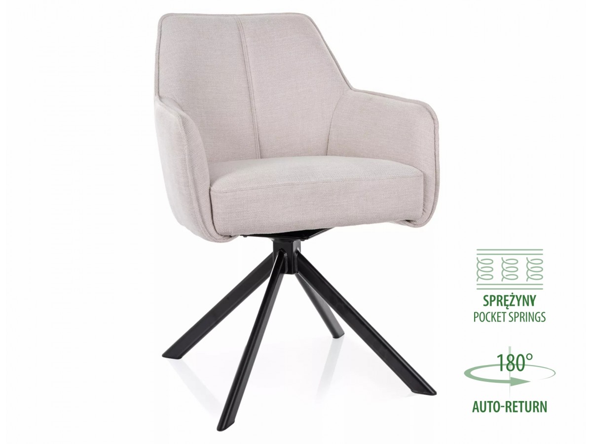 Krzesło, tapicerka: tkanina Brego 22, stelaż: metal, kolor: jasny beżowy / czarny metal.Funkcja auto-return - siedzisko obracane w zakresie 180st, z funkcją powrotu do pierwotnej pozycji. Sprężyny kieszeniowe w siedzisku.